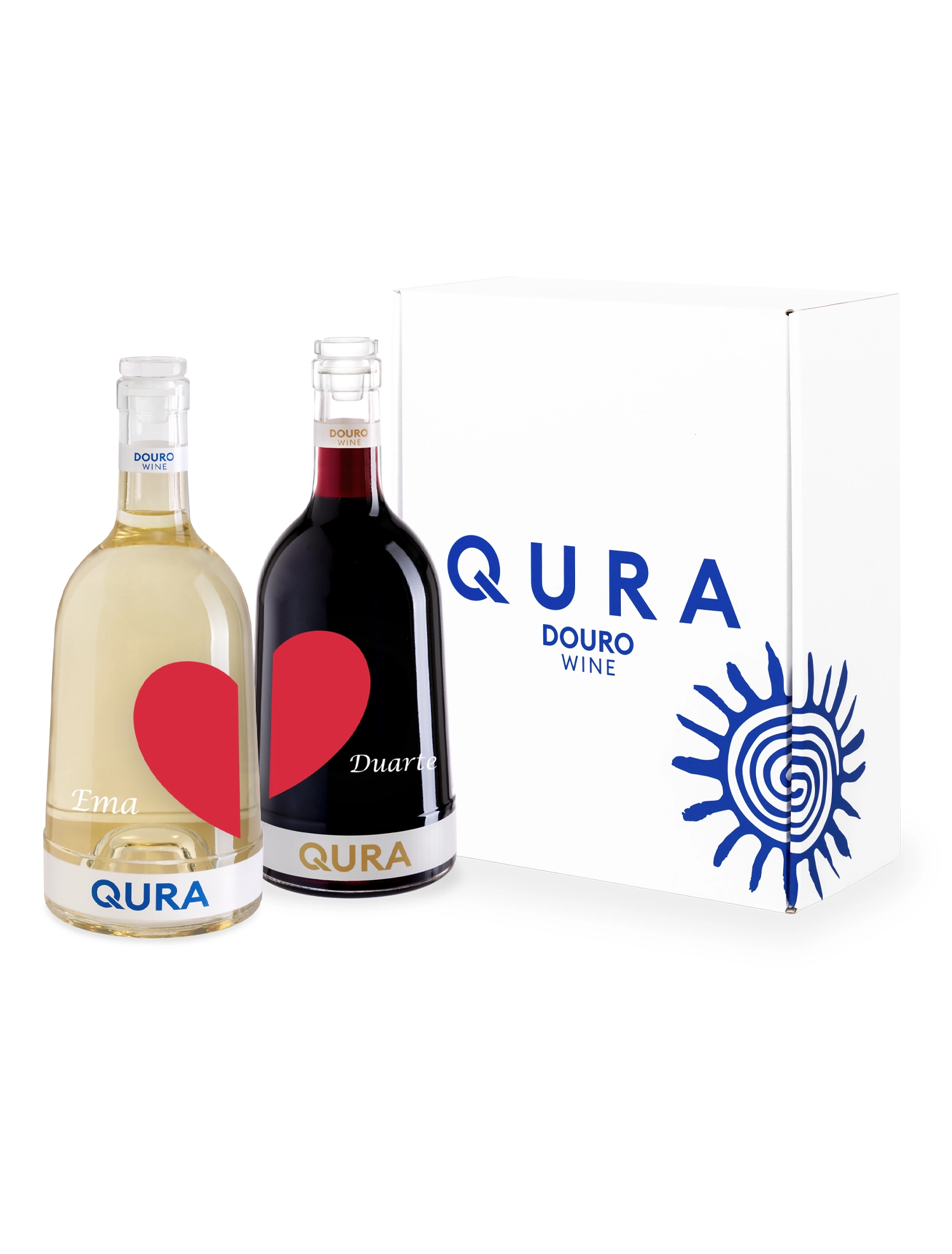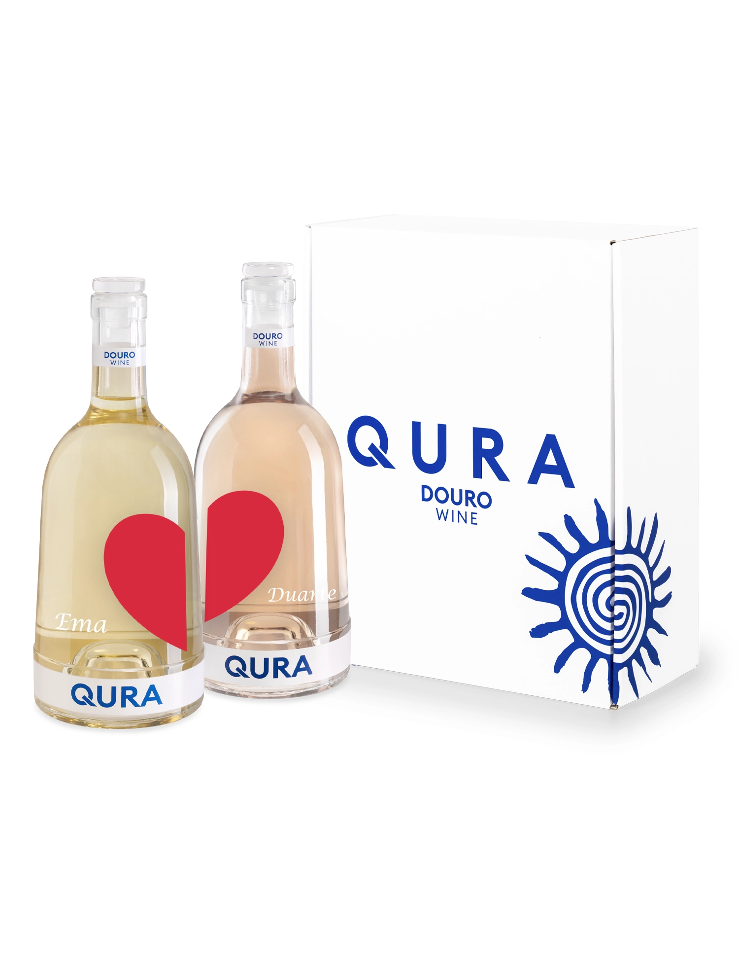 Este pack especial é composto por duas garrafas de vinho QURA, cuidadosamente concebidas para celebrar o amor. Cada garrafa pode ser personalizada com um nome exclusivo e apresenta metade de um coração no rótulo. Quando colocadas lado a lado, as duas garrafas unem-se para formar um coração completo, símbolo perfeito de união e cumplicidade.